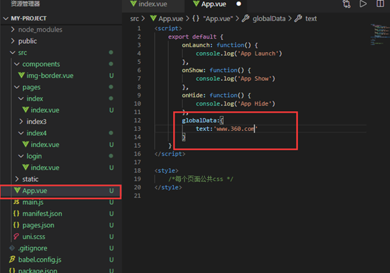 其他地方就可以通过 getApp().globalData.text获取值; getApp().onHide() 调用全局方法