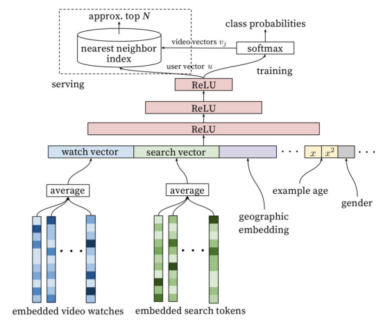 通过将推荐问题看成一个多分类问题(类别的数量等于视频个数),基于用户过去观看记录预测用户下一个要观看的视频的类别。利用深度学习(MLP)来进行建模,将用户和视频嵌入同一个低维空间,通过softmax激活函数来预测用户在时间点t观看视频i的的概率。具体预测概率公式如下:
