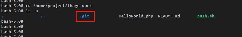 cd 到thago_work目录后使用 ls –a命令可以看到该目录下有一个.git文件夹,表示thago_work目录可以执行代码提交功能